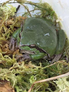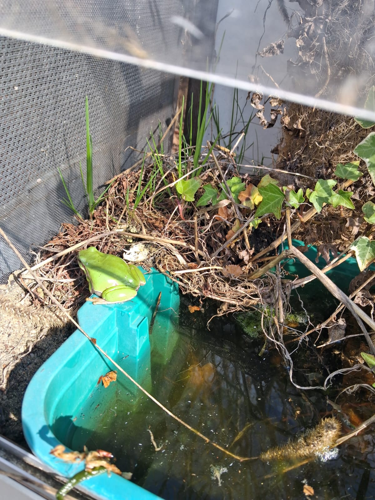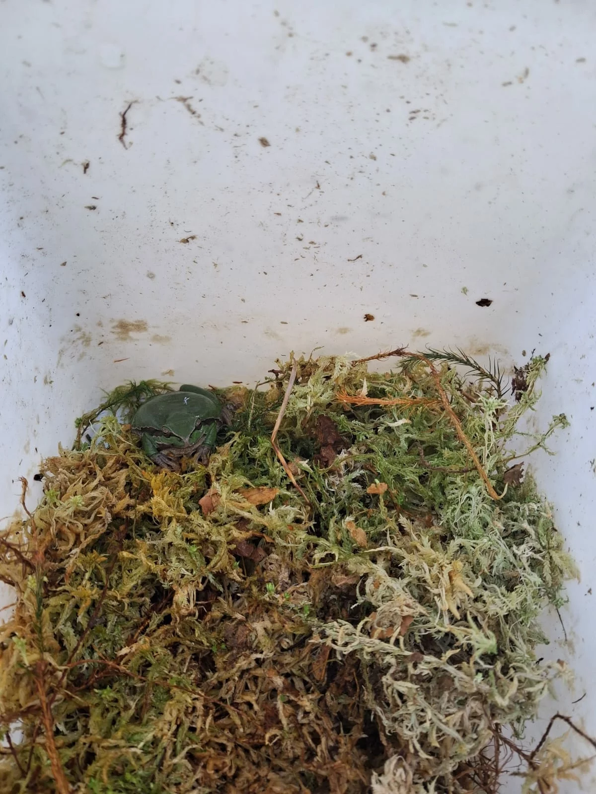 Der Frosch wurde vorsichtig geborgen und zunächst in einem Transportbehälter mit feuchtem Sphagnum-Moos untergebracht. Anschließend konnte das Tier in ein vorbereitetes Übergangsterrarium umgesetzt und dort sicher versorgt werden.